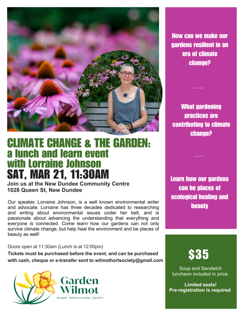 We are grateful to the original stewards of Turtle Island who have lived here since time immemorial. We acknowledge the land known as Wilmot is in the traditional territory of the Neutral, Anishinaabe, Haudenosaunee and Mississauga peoples and that many other First Nations, Métis and Inuit people make their homes here. We respect the Dish with One Spoon Treaty where we peacefully share and protect the land, waters and its resources while only using what we need. The Wilmot Horticultural Society invites us to take our responsibility for the earth and its inhabitants as a guiding principle.